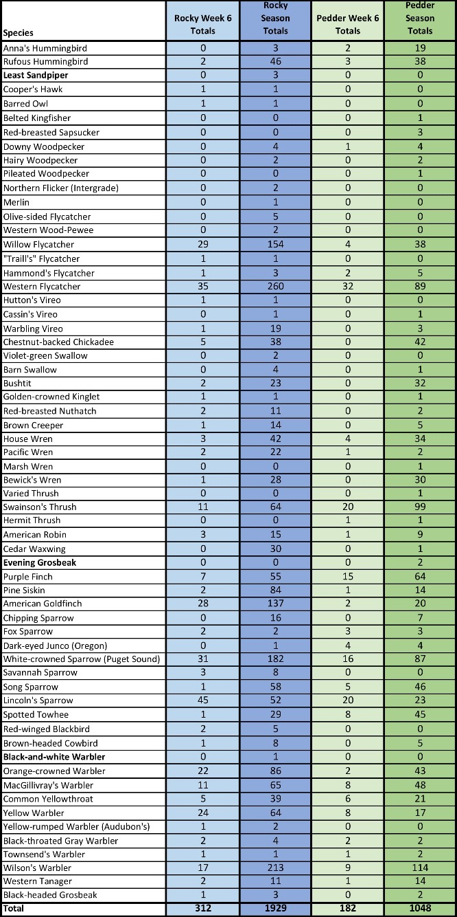 with Pedder Bay banding 182 new birds, slightly below the week 6 average of